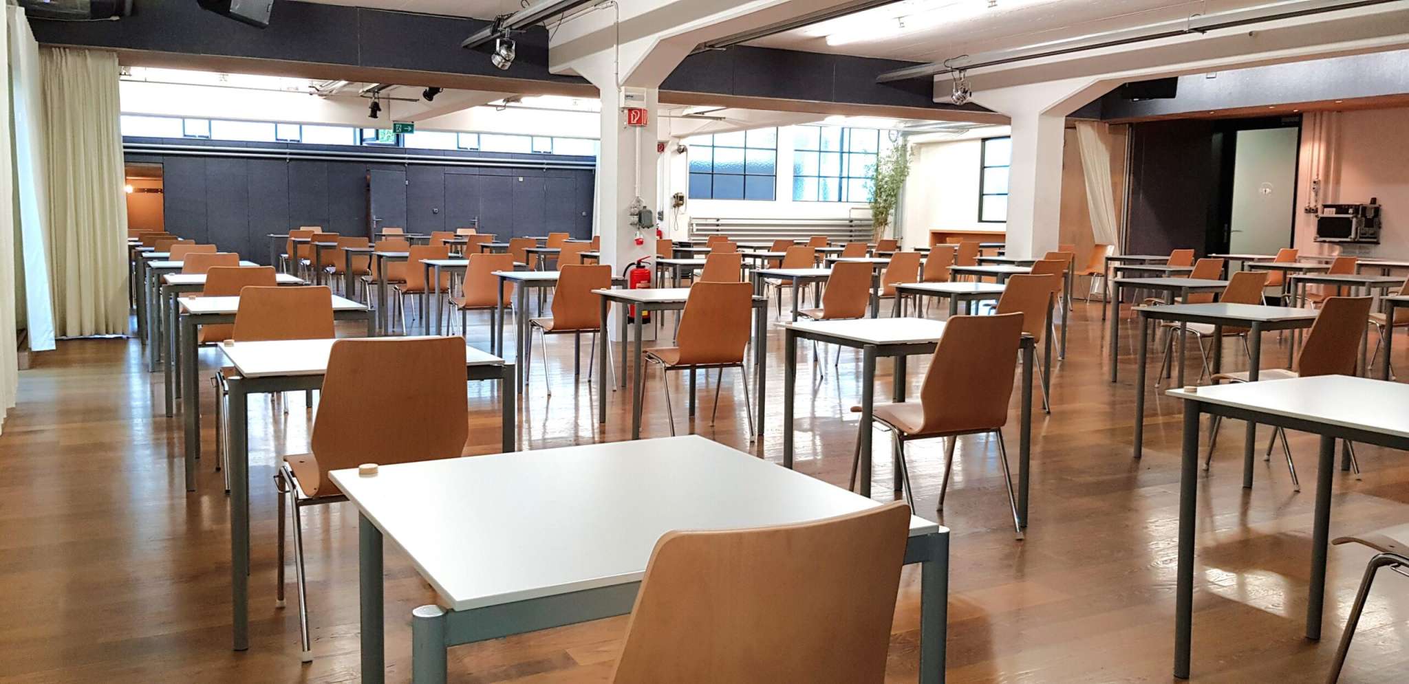 Die Halle 2A + 2B kann durch eine feste Trennwand flexibel in zwei separate Räume aufgeteilt werden. Der federnde Holzboden aus Eichenparkett ermöglicht Tanz, Karate, Yoga und Taekwon-Do Kurse, Beamer, Leinwand und je eine Musikanlage auf beiden Raumseiten sind ideal für Seminare, Prüfungen oder als Breakout-Räume. Du hast Zugang zum stilvollen Foyer 2 und gepflegten Toilettenräumen, optional auch zu Garderoben mit Nasszellen.